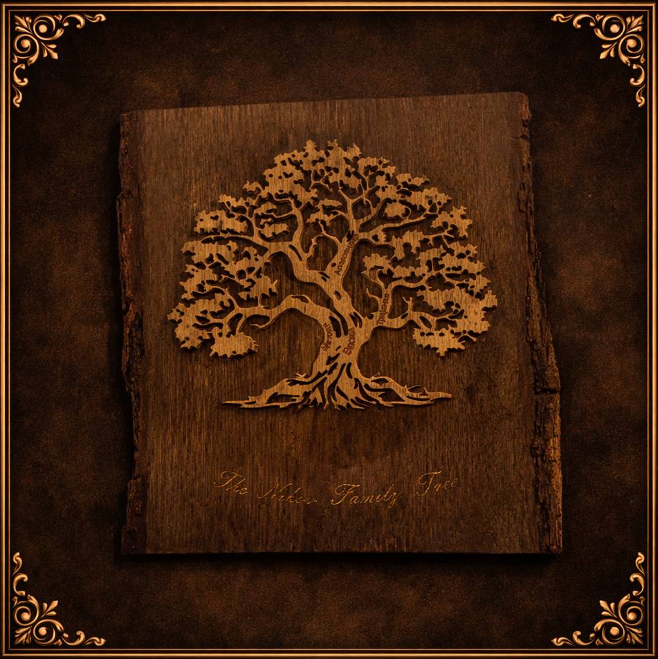 • Unterhalb des Baumes befindet sich die Gravur „The Nikov Family Tree“, die negativ in das Holz eingefräst wurde. Der Kontrast zwischen positiver und negativer Gravur verleiht dem Werk eine besondere Tiefe und Eleganz.