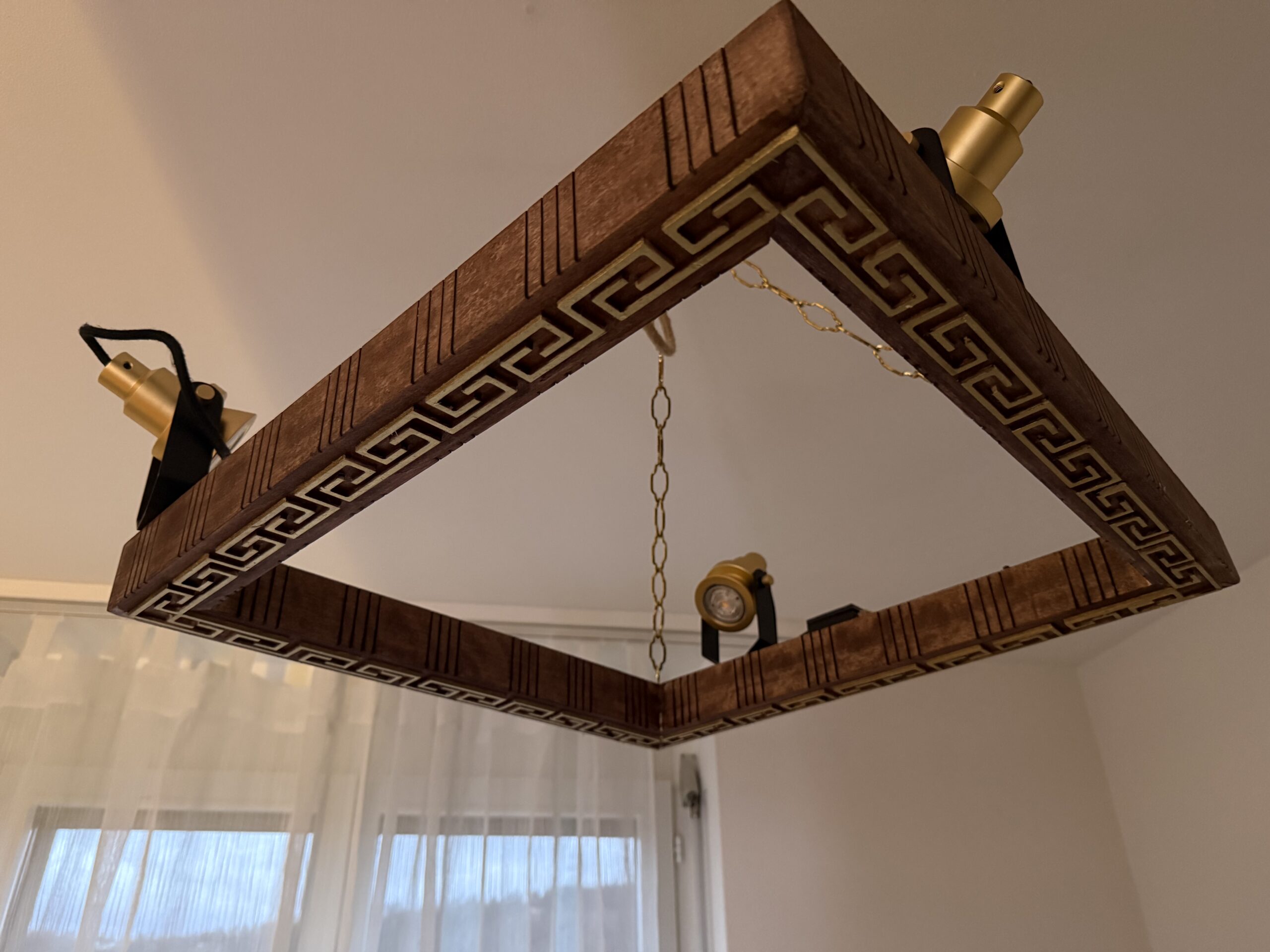 • Ein weiteres charakteristisches Detail ist die antike Metallkette, die im Inneren des Rahmens gespannt ist und die Beleuchtungselemente miteinander verbindet. Dieses Element unterstreicht den handwerklichen Charakter der Lampe und ergänzt das Design mit einem subtilen historischen Akzent.