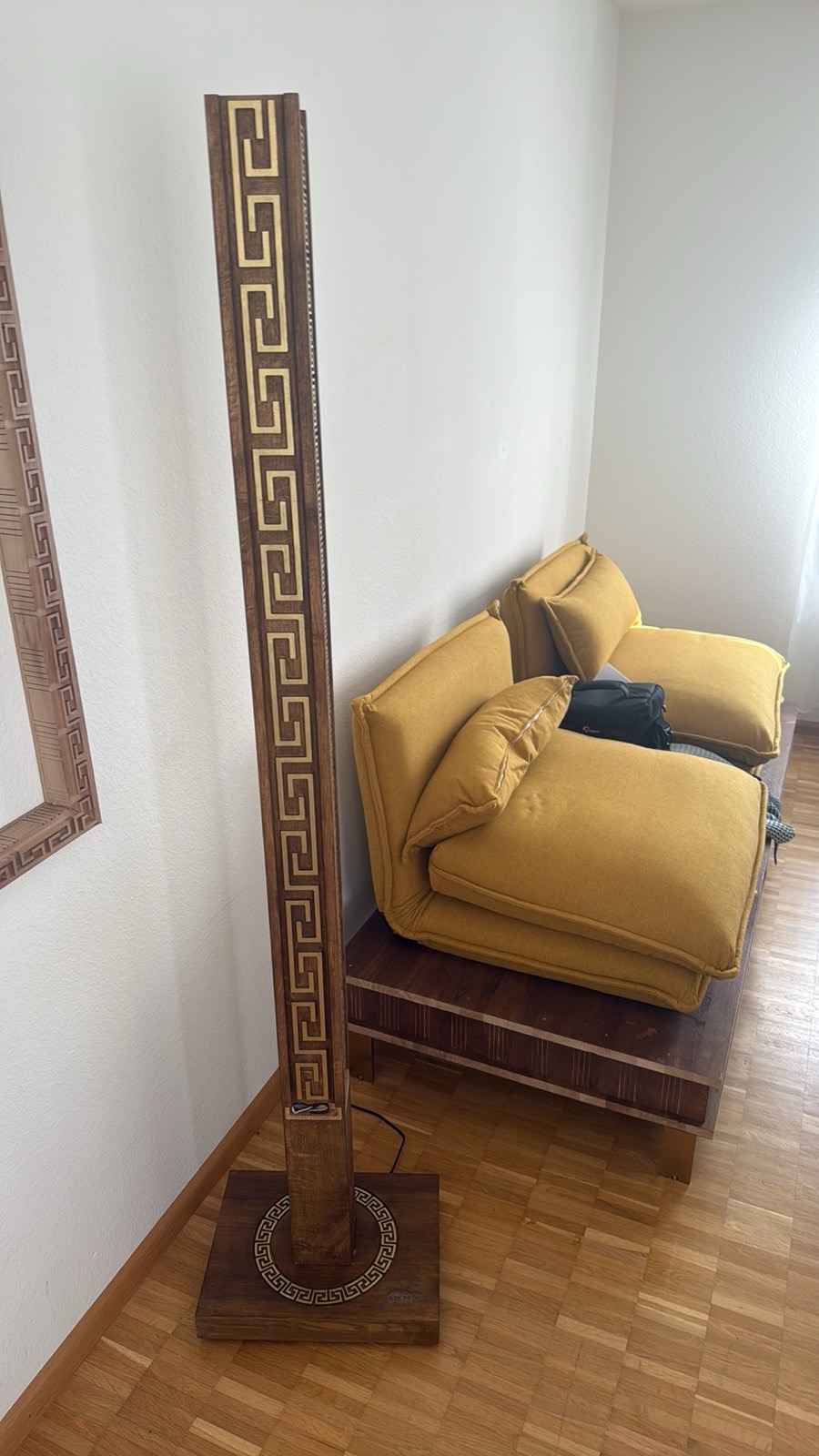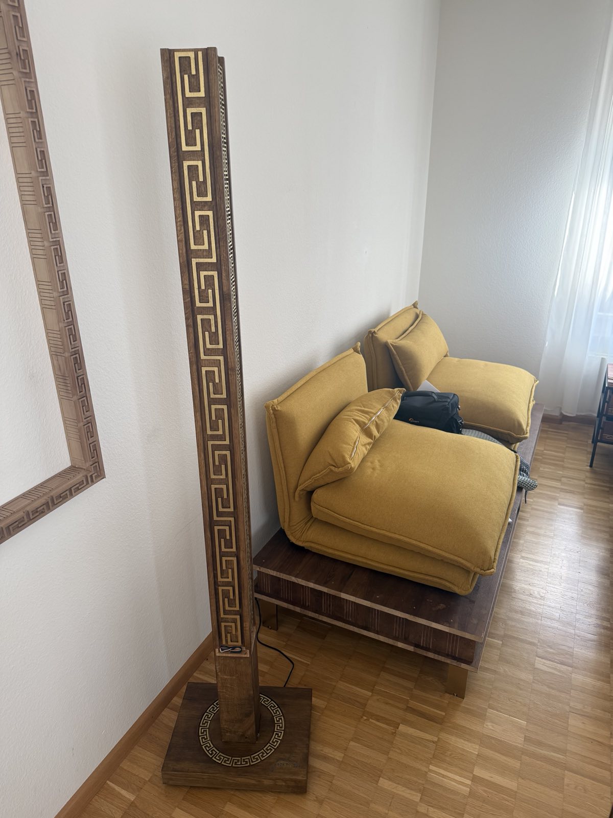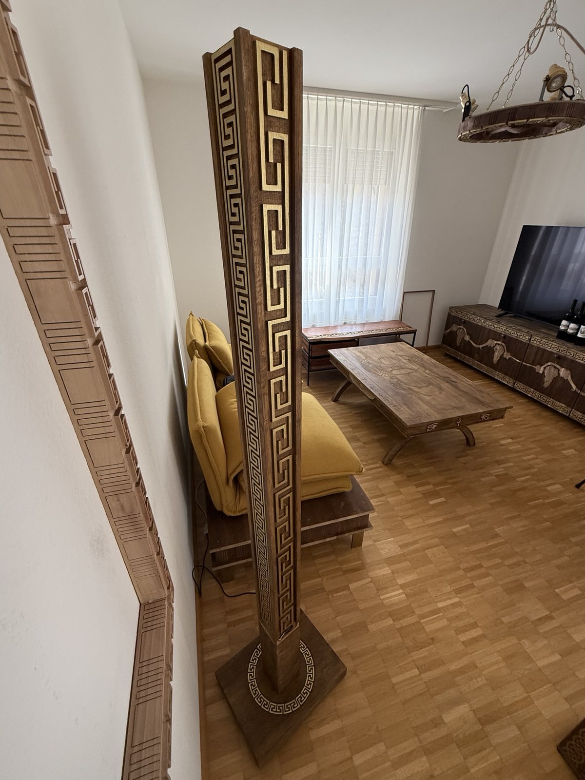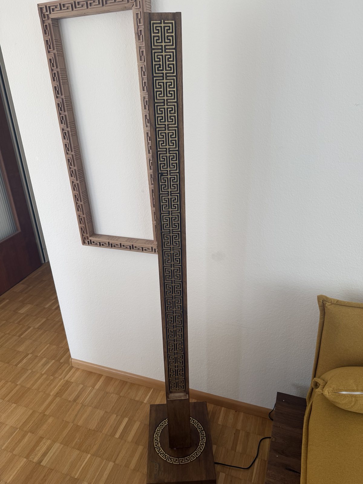 - Die schlanke, vertikale Form verleiht der Leuchte eine klare und ruhige Präsenz im Raum. Auf drei Seiten der Holzstruktur befinden sich dekorative antike Bordüren, die präzise in das Holz eingearbeitet wurden und dem Objekt eine charaktervolle, zeitlose Gestaltung verleihen.