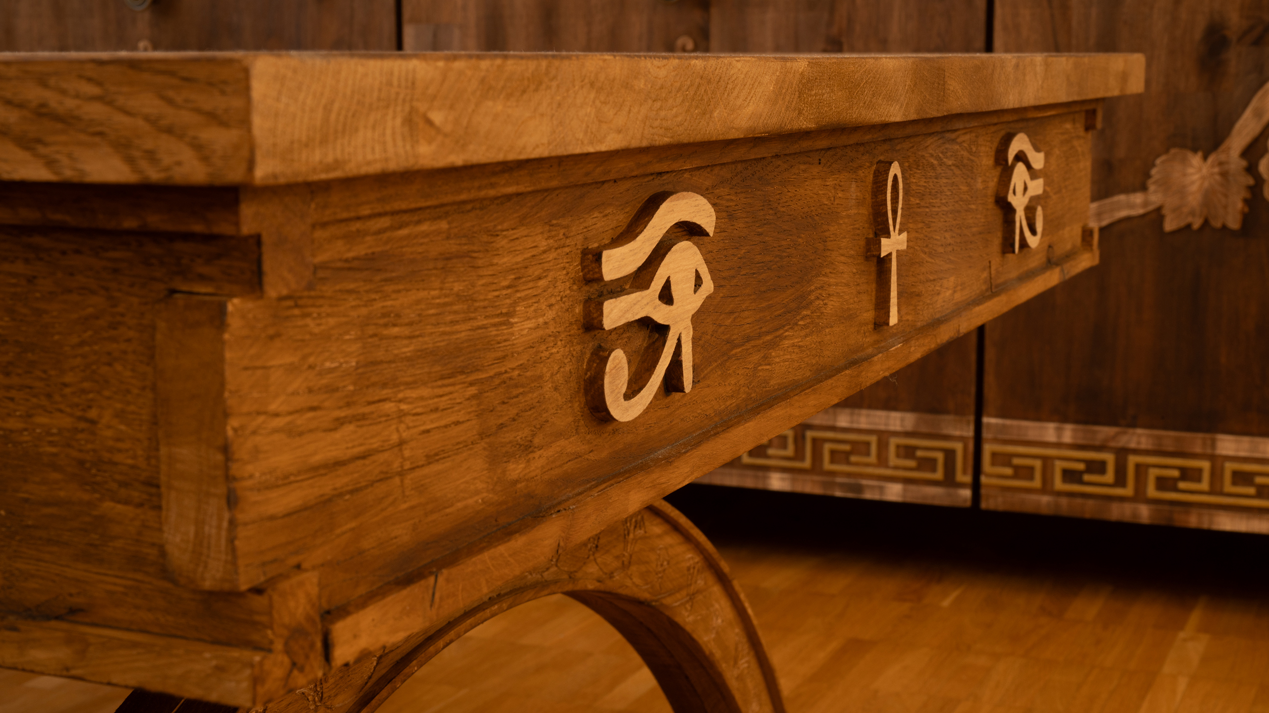 • Die Gesamtkomposition verweist sowohl auf das Prinzip der kosmischen Ordnung als auch auf den Gedanken des göttlichen Intellekts. Die von den Ägyptern als Maat bezeichnete Ordnung verkörpert Wahrheit und Gleichgewicht als universales Gesetz. Thot hingegen, Gott der Weisheit und des heiligen Wissens, steht für die geistige Instanz, die dieses Gesetz erkennt, formuliert und erhält.