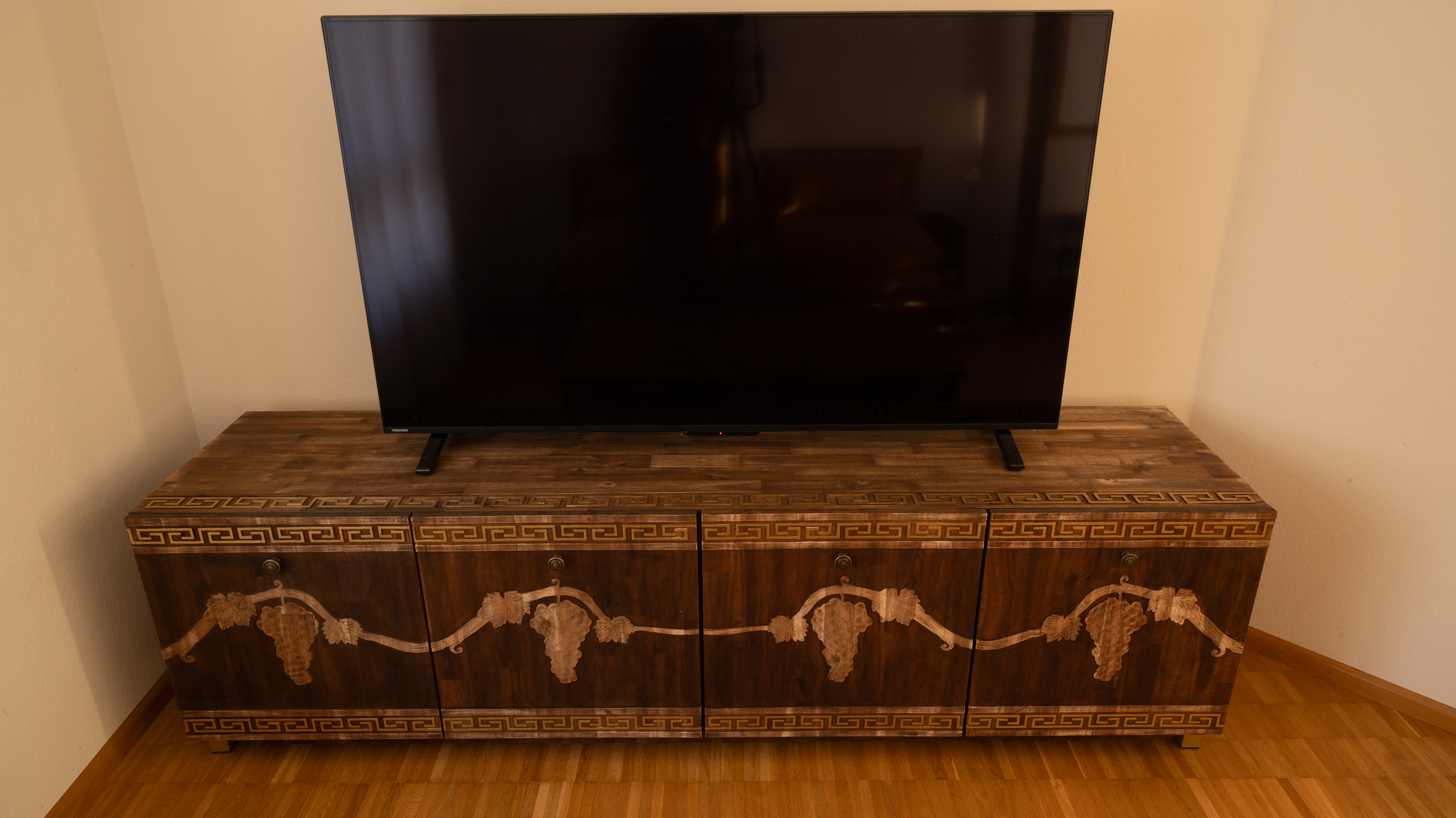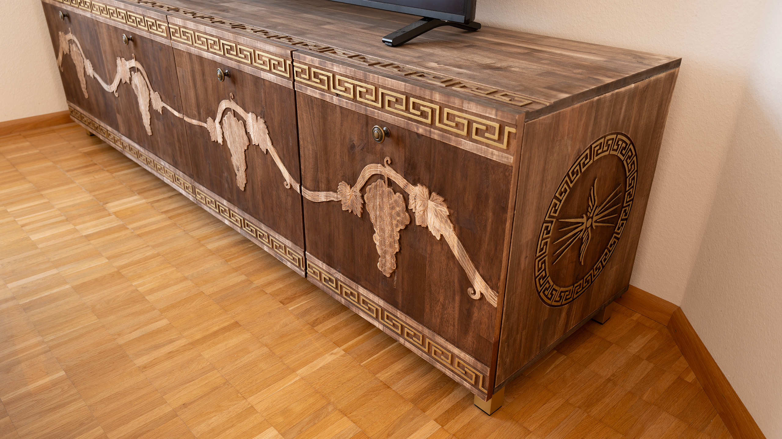 - In der Verbindung von Traubenmotiven, antiker Ornamentik und klarer Form entsteht ein Möbelstück, das nicht nur funktional ist, sondern zugleich die Wirkung eines kunstvollen Sammlerobjekts besitzt. Die Gestaltung erinnert an Fülle, Kontinuität und kulturelle Tradition.
