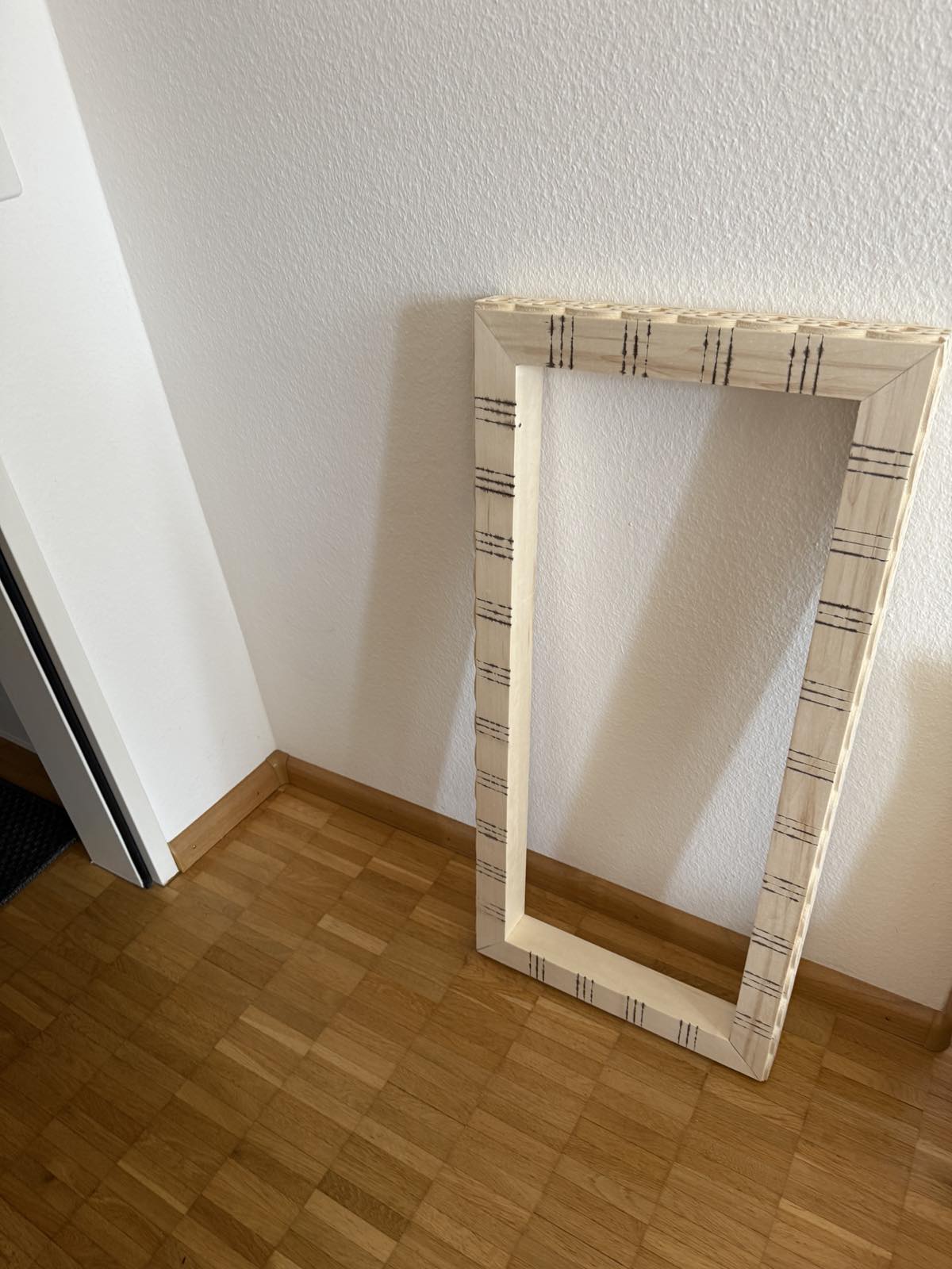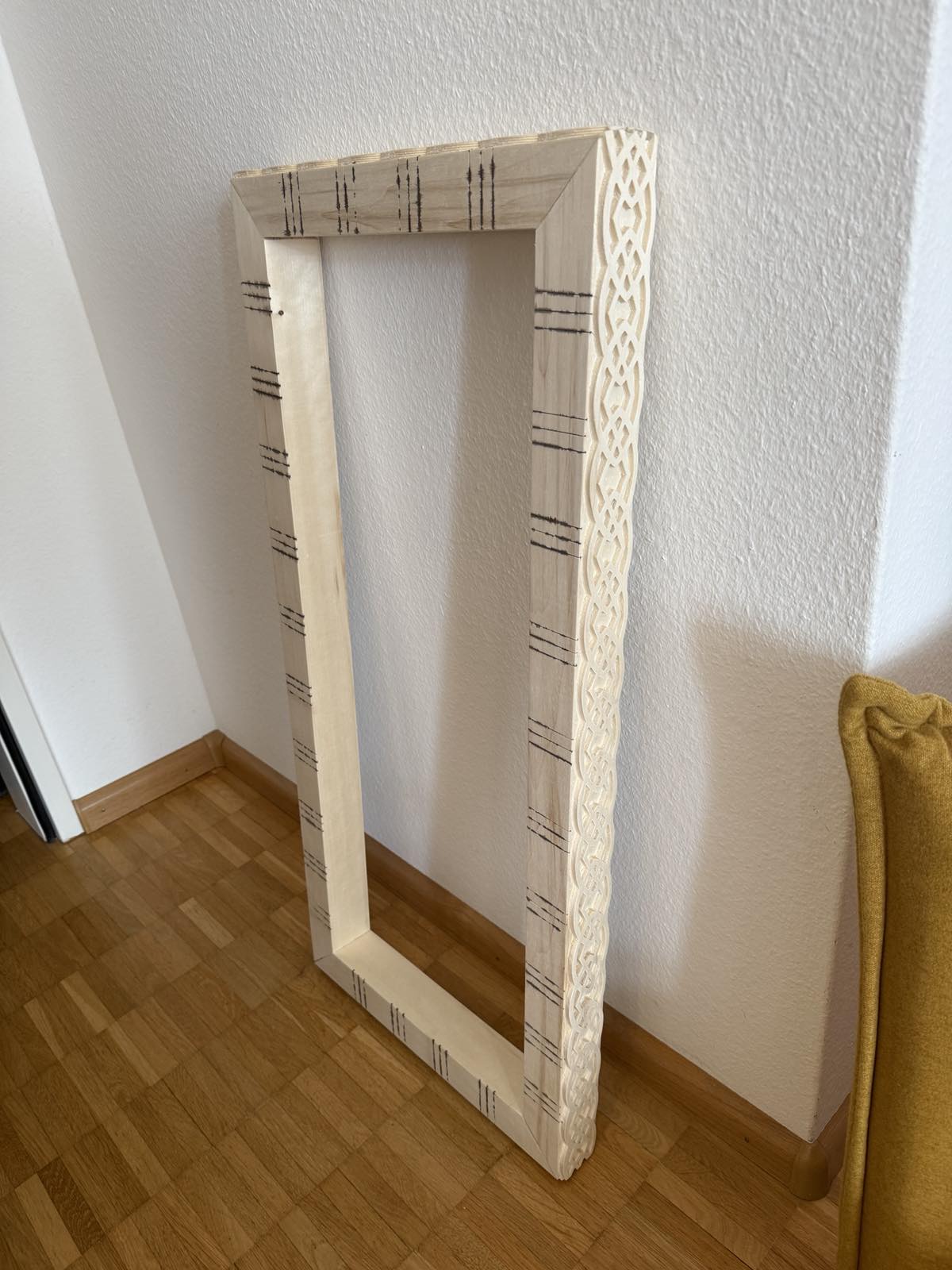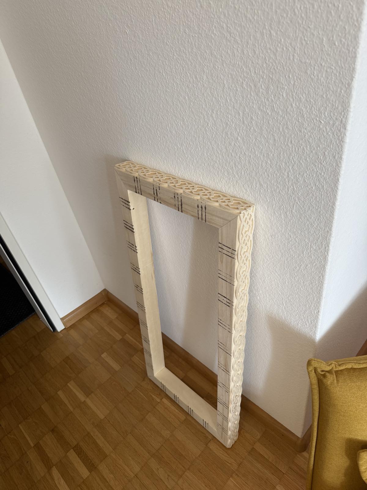 • The front side of the frame features an antique chain ornament, precisely engraved into the wood. This classical motif gives the frame a timeless and decorative character while emphasizing the craftsmanship of the work.